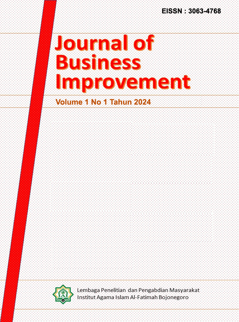 Editor in Chief: Azwar CholiliManaging Editor : Muhamad Mujib Publisher : Institut Agama Islam Al-Fatimah Bojonegoro Frequency: Three issues per year (February, June and October)Indexing: Google Scholar, Garuda Journal of Business Improvement is a peer-reviewed, double-blind journal published by Lembaga Penelitian dan Pengabdian Masyarakat (LPPM) at Institut Agama Islam Al-Fatimah Bojonegoro, East Java, Indonesia. Journal of Business Improvement publishes research and concept papers in the field of Islamic economics, business, and management in an open-access format, allowing users to freely access and download the articles.
