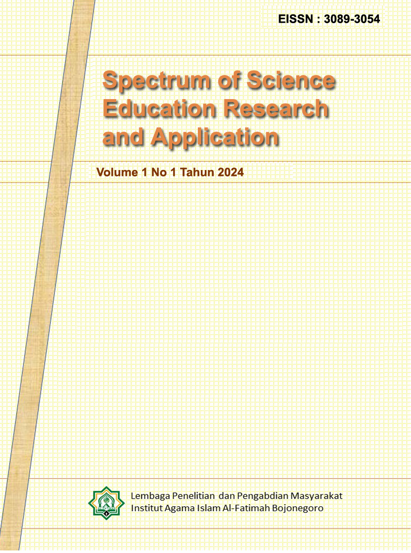 Editor in Chief: Shobrina Nurul MufidaManaging Editor : Tri Lestari Budi Asih Publisher : Institut Agama Islam Al-Fatimah Bojonegoro Frequency: Two issues per year (June and December)Indexing: Google Scholar Spectrum of Science Education Research and Application is a peer-reviewed, double-blind journal published by Lembaga Penelitian dan Pengabdian Masyarakat (LPPM) at Institut Agama Islam Al-Fatimah Bojonegoro, East Java, Indonesia. Spectrum of Science Education Research and Application publishes a scientific paper on the results of the study and review of the literature in the sphere of natural science education in primary education, secondary education, and higher education. Additionally, this journal also covers the issues of environmental education & environmental science. Spectrum of Science Education Research and Application in an open-access format, allowing users to freely access and download the articles.